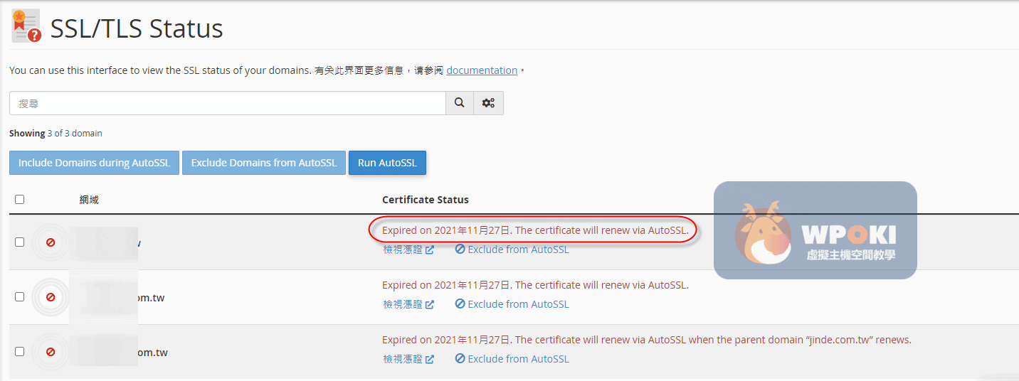 - 在SSL/TLS顯示的網址名稱,若未正確指向主機,請先勾選該網址後,按下:Exclude Domain from AutoSSL(如下方操作詳解)。否則會持續申請失敗,拖慢所有SSL申請。