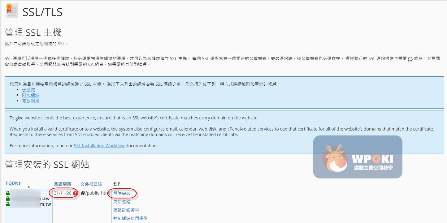 - 若有過期SSL,先至SSL/TLS→管理 SSL 主機找到該網址解除安裝(下圖示意)。
