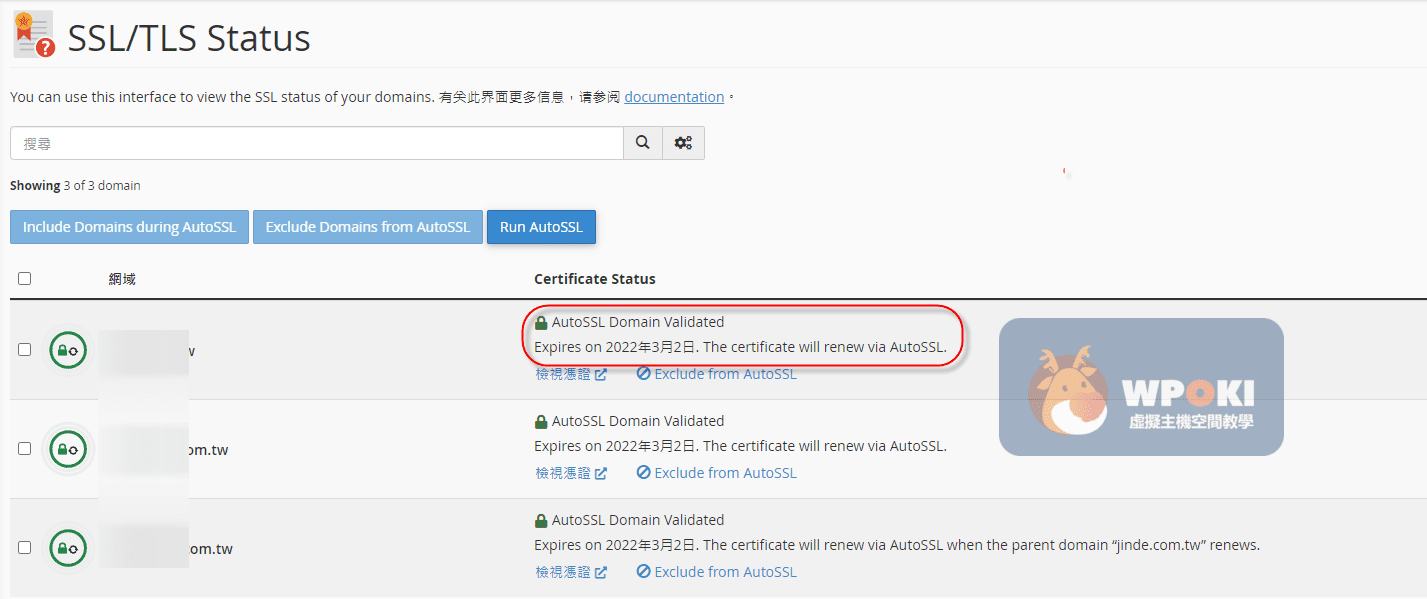 - AutoSSL的時效為3個月,到期後自動續期。建議定期登入 cPanel 控制台檢查 SSL 狀態,確保無逾期未自動續發。