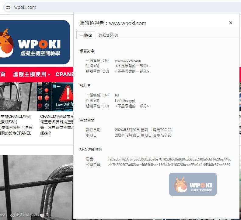 憑證安裝後,可用瀏覽器(例如Chrome)點選網址列鎖頭,檢查SSL簽發者(如Let’s Encrypt),及有效期間。