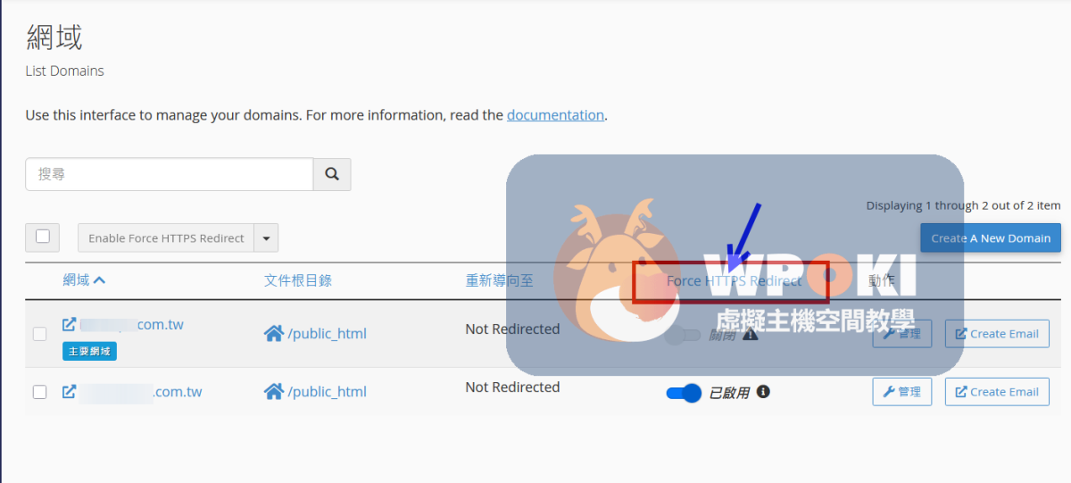 4. 找到您要設定的網域名稱,查看其最後一欄「強制 HTTPS 轉址 (Force HTTPS Redirect)」。