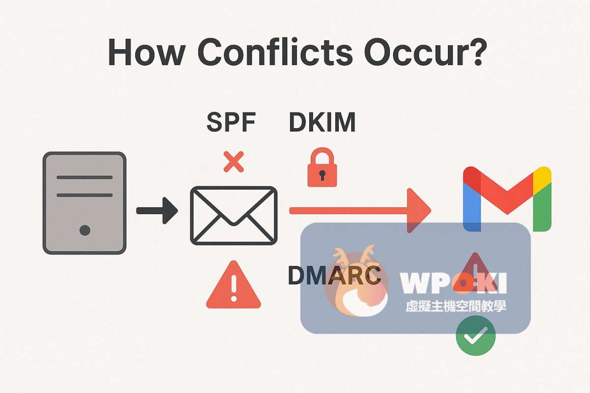 這個轉寄過程,在 Gmail 眼中看來,就是您的 cPanel 主機(台中轉運站)試圖「偽造」成王小明(台北郵局)在寄信。這正是 SPF 和 DMARC 驗證機制所要打擊的目標!因此,cPanel 合法的「轉寄」行為,反而觸發了反垃圾郵件的防護機制。