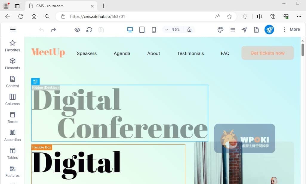 - 設計彈性且所見即所得:用戶可以透過拖放瀏覽器界面來設計網站,無需編寫代碼。