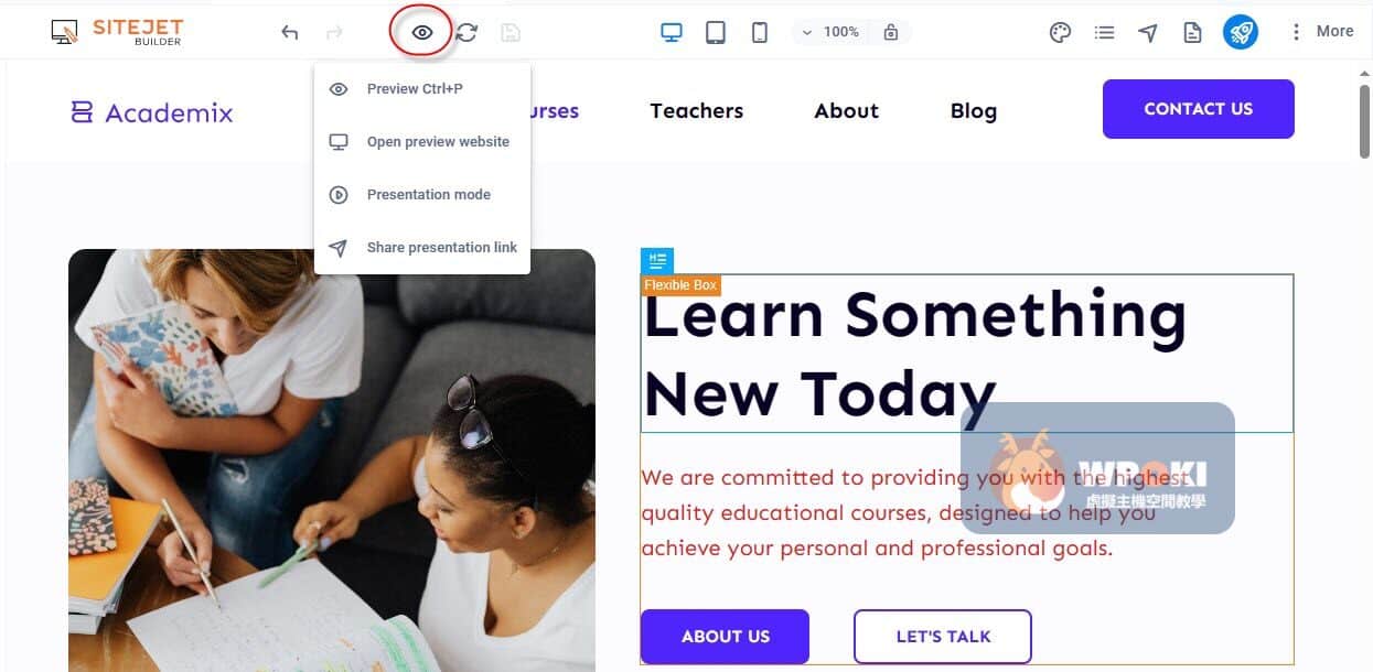 1.編輯所見即所得,且立即切換目前網頁狀況:所見即所得讓編輯網頁變得更順利;而可以一鍵切換目前網頁的狀況,不需要先上傳,也不需要網址指向完成即可以查看到,全部都於Sitejet Builder提供的介面裡可以完成。此流程能降低反覆發佈的成本,適合頻繁微調版面的情境。