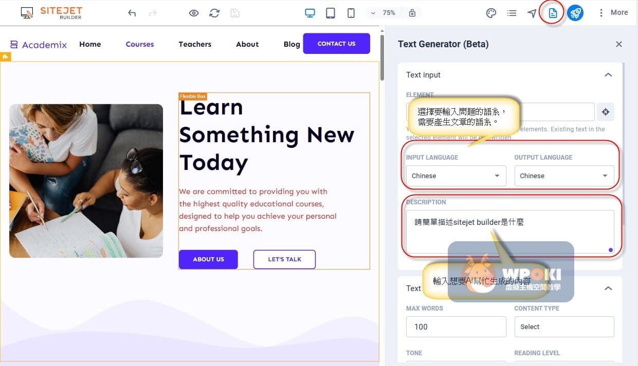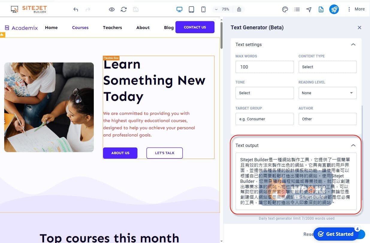 4.AI文字產生器(Text Generator):Sitejet Builer提供的Text Generator是一個AI功能,可以幫忙生成文章、文字,而且支援多種語系生成。同時Text Generator也變相提供不同思路下的文章,方便使用者挑選使用。建議先輸入清楚的頁面目標與受眾,再微調口吻與段落長度,以提高可用度與一致性。P.S. 上圖為問題描述;下圖為文章生成。