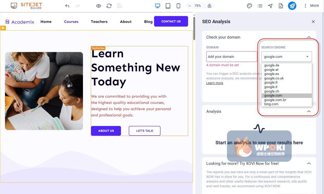 5.SEO設定與分析:SEO Setting 為該頁面SEO設定,再用SEO Analysis來分析,如下面第二張圖,可以選擇Google 各國引擎來分析。許多網友表示,透過上述3、4、5點,可以快速完成頁面切換、文案生成與 SEO 快速檢核,顯著節省建站時間與溝通成本。