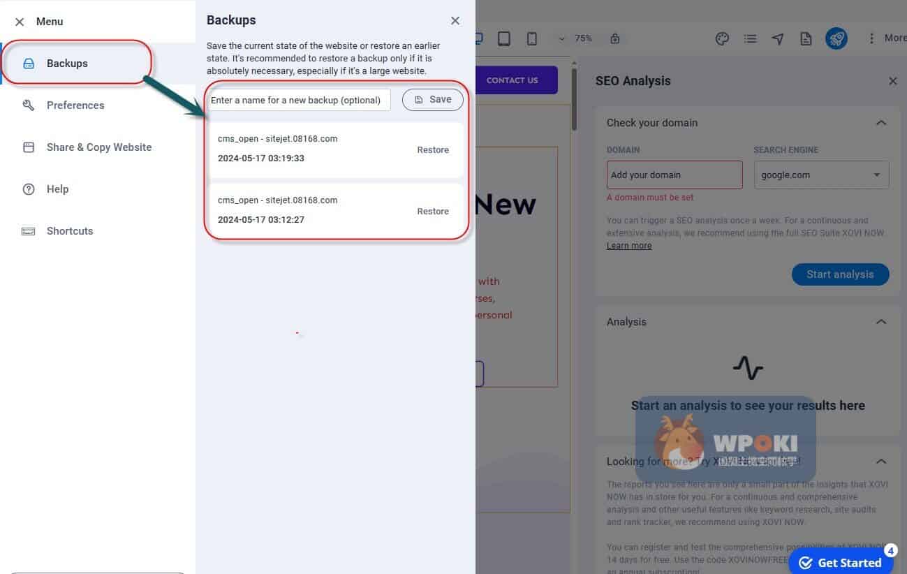6.線上/紀錄backup還原功能:點選頁面左上角會有〝☰〞的符號,會看到Backup的功能。該功能可以針對備份您的設定(可以自定名稱)與還原,因此最適大批次修改或是有各種Plan A、B、C的狀況留存,可以快速的還原或套用。上線前建議建立「備份點」,發現問題可立即回復;發佈後請再以實際網址驗證快取與 SSL 是否正常。