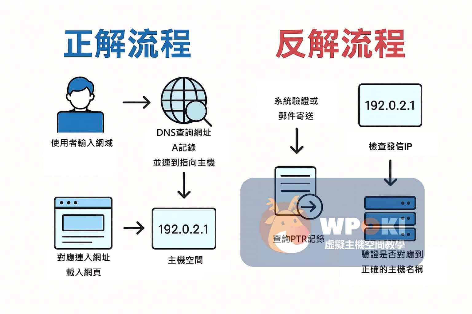 為了幫助新手更快理解 DNS 正解與反解的差異,可以用簡單的流程圖來解釋: