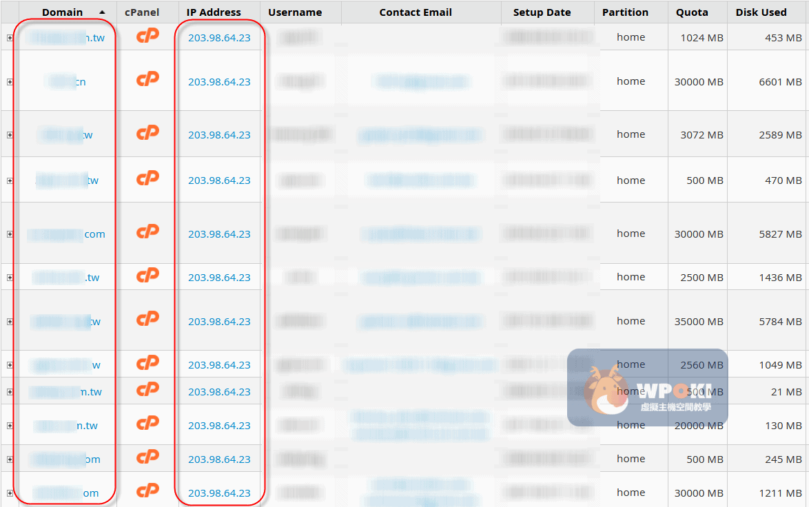下圖即為 cPanel 後台展示共享IP+固定IP的畫面,主機中的所有網站都是用這組IP(何謂cPanel?):