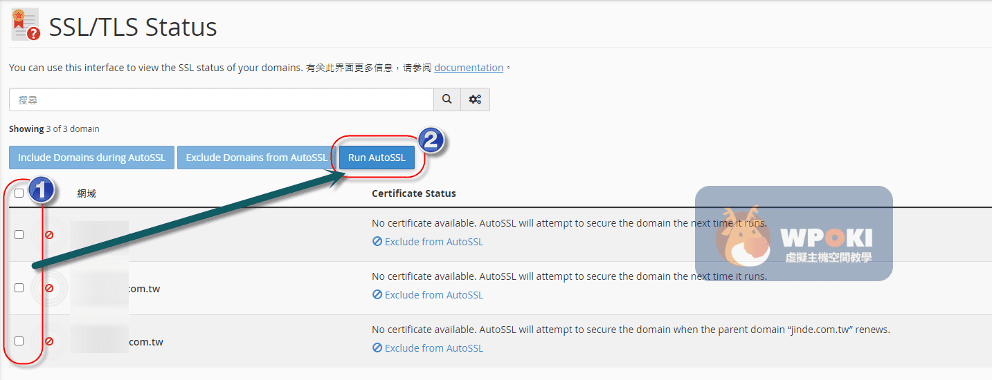 • 在SSL/TLS顯示的網址名稱,若未正確指向主機,請先勾選該網址後,按下:Exclude Domain from AutoSSL(如下方操作詳解)。否則會持續申請失敗,拖慢所有SSL申請。