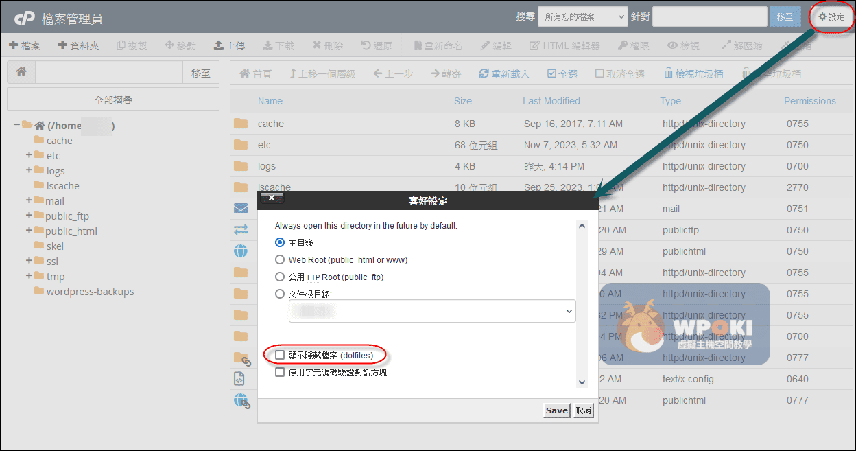 ①至cPanel→檔案管理員→點選:右上角〝設定〞→勾選〝顯示隱藏檔案〞