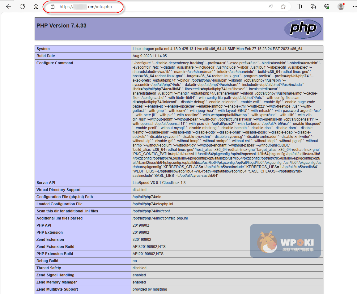 該方式就是確認PHP版本是否成功切換所需要版本;故會需要避開使用系統方式確認,因此無法於cPanel控制台上操作使用,是使用在瀏覽器中輸入http://您的網址/info.php 網頁方式來呈現主機空間的所有PHP配置設置。