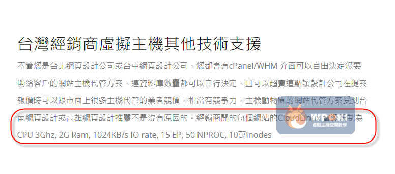 ④ 承③,現在使用cPanel控制台的主機空間商會搭配CloudLinux,故經銷商主機可以限制空間、流量多寡,但無法限制每個cPanel帳號的主機使用資源(如:CPU、RAM、I/O…等),每個cPanel帳號的主機空間可用資源是固定的(由CloudLinux限制住)。