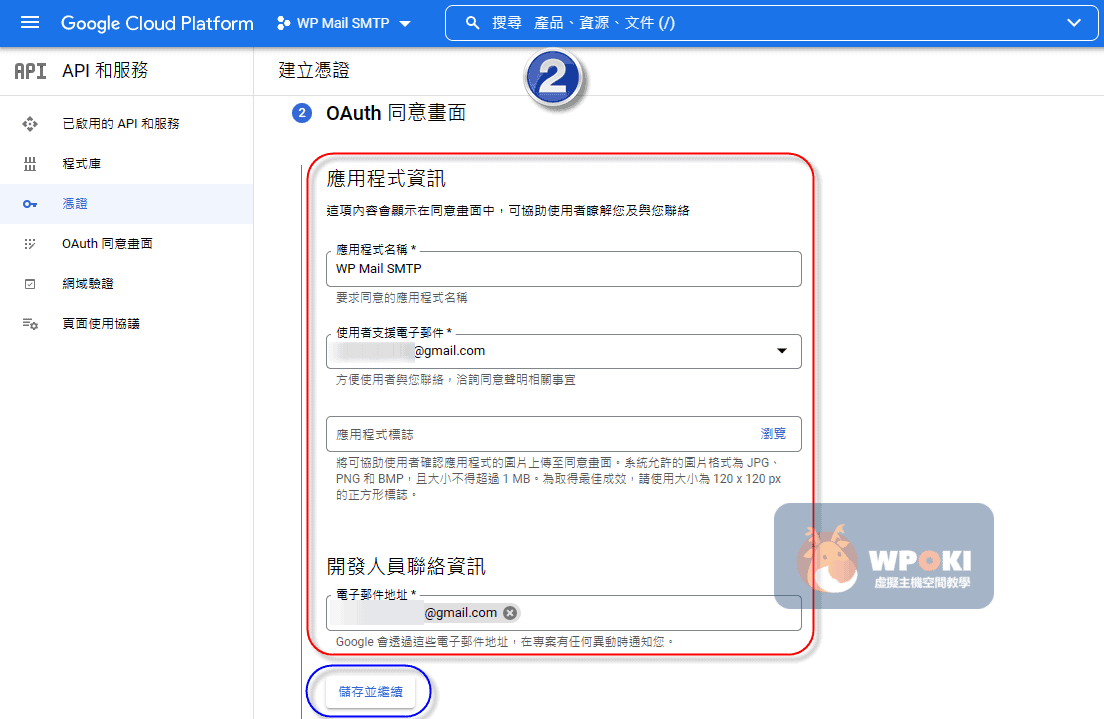 返回 WordPress 外掛設定頁,在 紅框 處輸入剛剛取得的「用戶端帳號與密碼」,然後按下 儲存設定。接著點擊橘色按鈕,授權外掛使用 Google 帳戶發信。