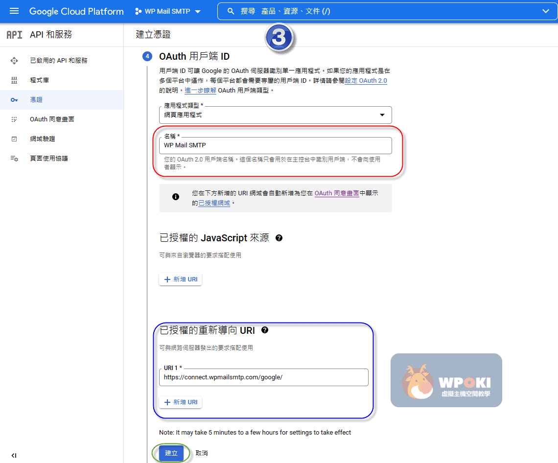 在頁面③區塊(紅框/藍框)會出現稍後設定憑證時需要的 「已授權的重新導向 URI」。請先複製備存(外掛常見為 https://connect.wpmailsmtp.com/google/,仍以實際畫面為準),之後在 GCP 憑證設定時必須完全一致,避免 redirect_uri_mismatch 錯誤。
