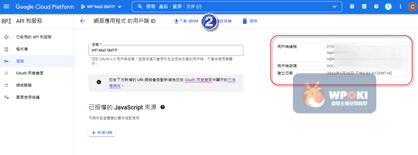 完成後進入「憑證」頁,點選 藍框 編輯圖示,即可看到 用戶端帳號與密碼,請複製保存,稍後需要填入 WP Mail SMTP。