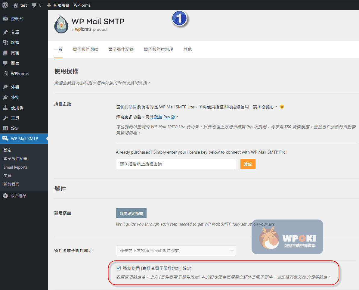 進入外掛設定頁面,依圖示操作:在頁面①區塊 紅框 中勾選 「強制使用[寄件者電子郵件地址]設定」。此舉可避免表單外掛或其他程式覆寫 From 位址,造成 SPF/DKIM 驗證不一致,提升寄達率。