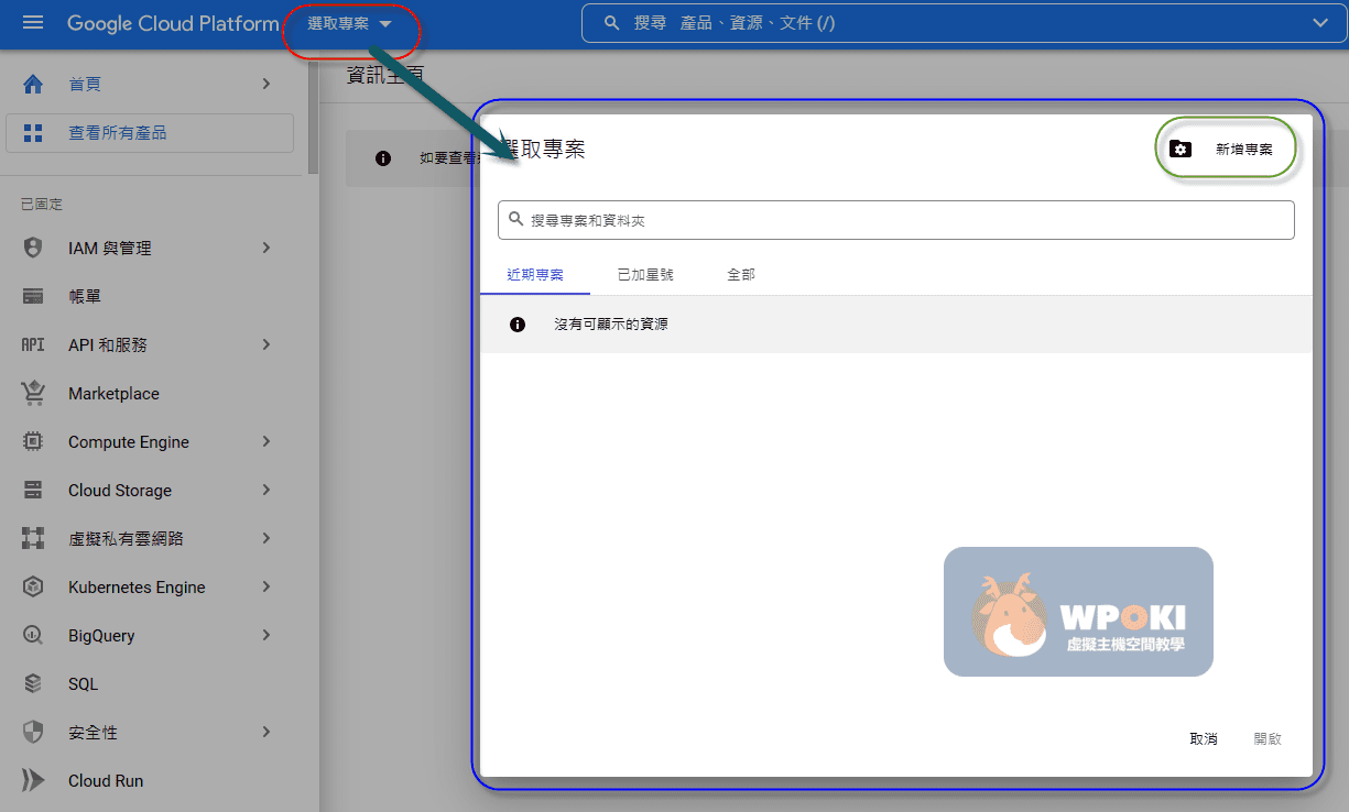 另開視窗登入 Google Cloud Platform(GCP)。點擊 紅框「選擇專案」→ 於 藍框 視窗中點擊 綠框「新增專案」。此專案將專責 Gmail API 與 OAuth 設定。