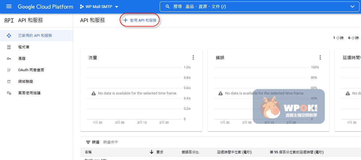 在「API 和服務」頁面點擊 紅框「+啟用 API 和服務」,準備從目錄中選擇要啟用的服務。
