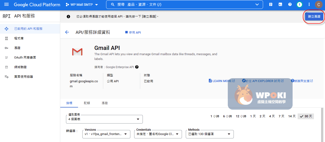 Gmail API 啟用後,請點擊右上角 紅框「建立憑證」。若畫面跳回 API 清單,請重複步驟 5~8,直到 Gmail API 狀態顯示「已啟用」。